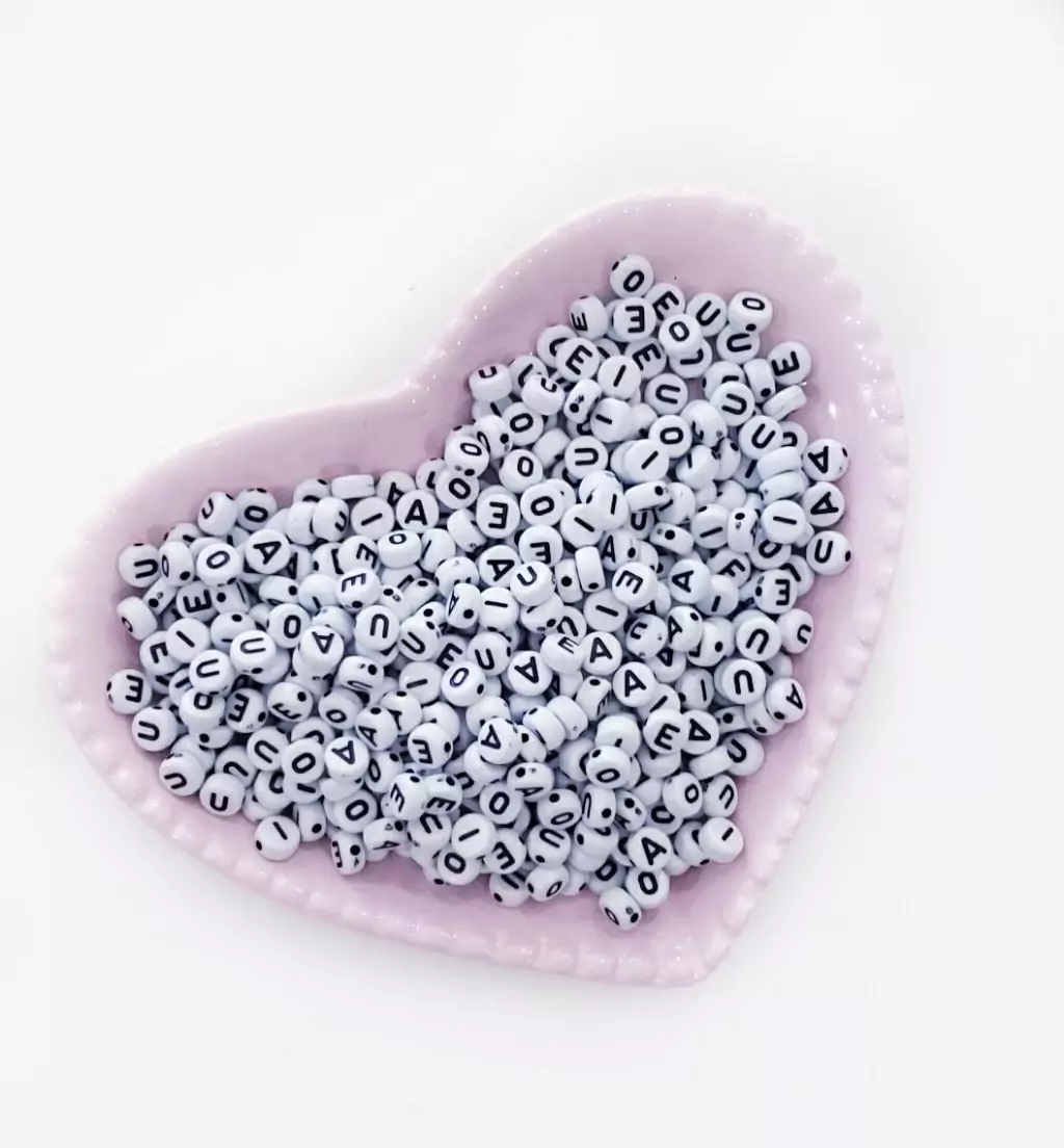 Conta para Pulseira Redonda Achatada Branca Letras Preta Sortidas Vogais