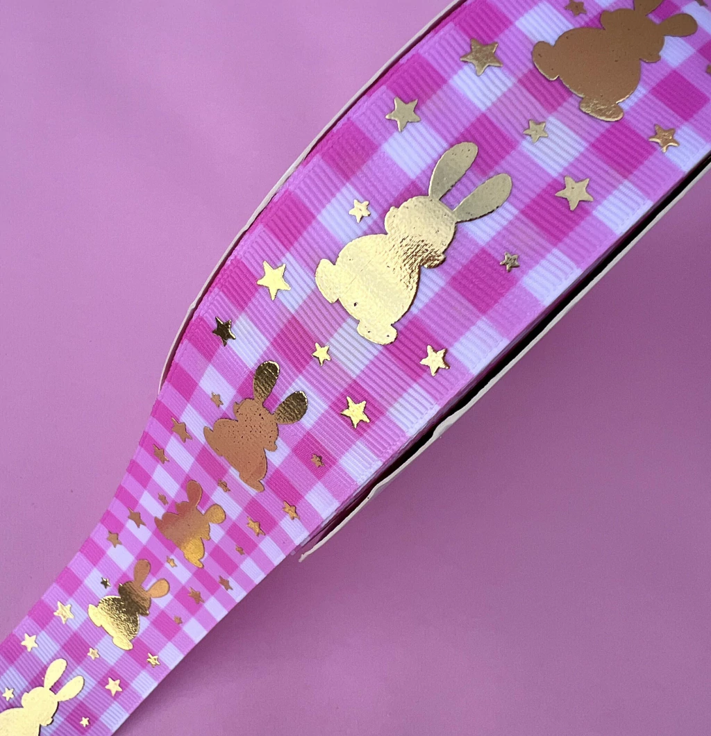 Fita Gorgurão Xadrez rosa Coelho Dourado 38mm (2 metros)