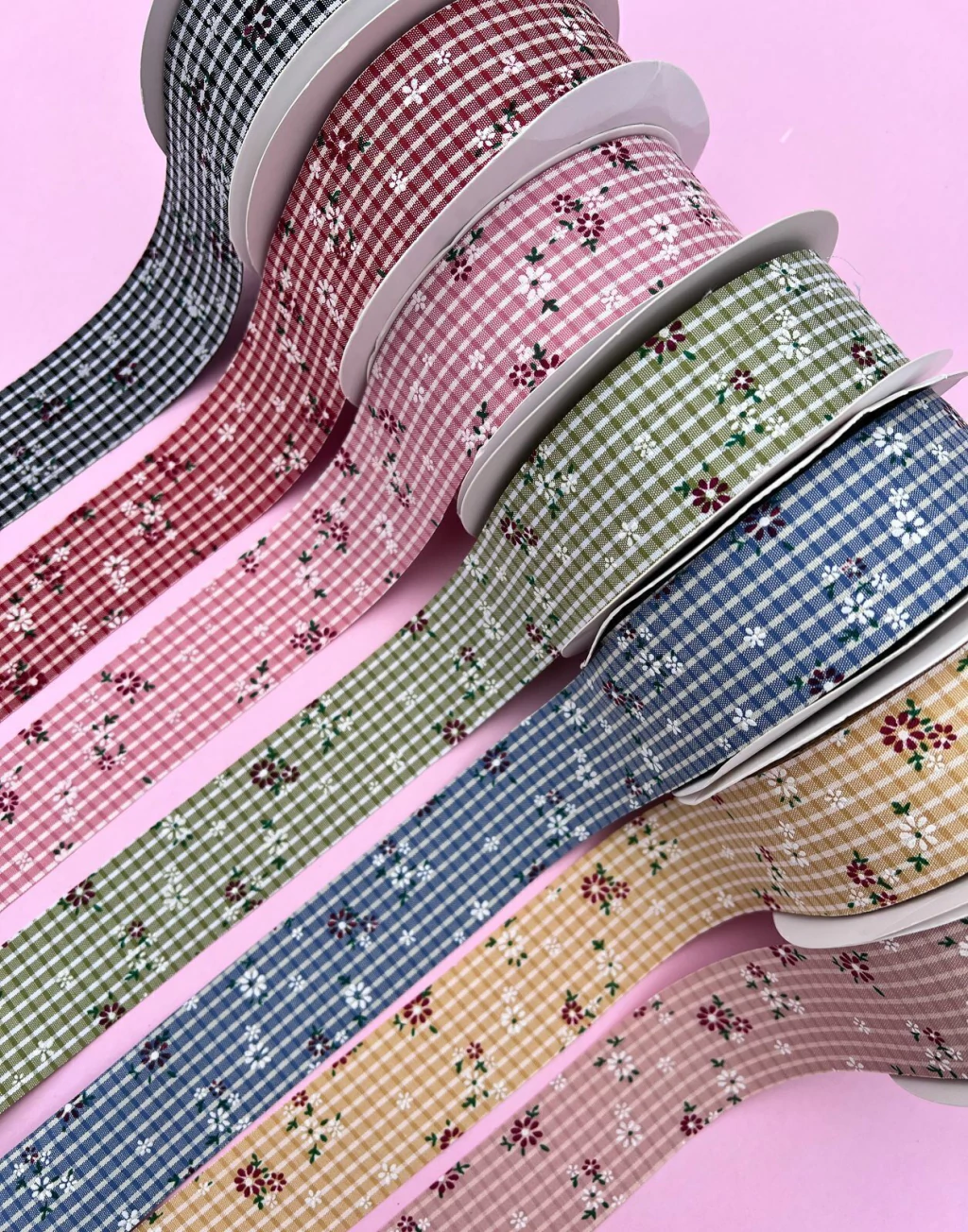 Fita Tecido Xadrez Ramalhete de Flores Dupla face Cetim 38mm (1 metro)